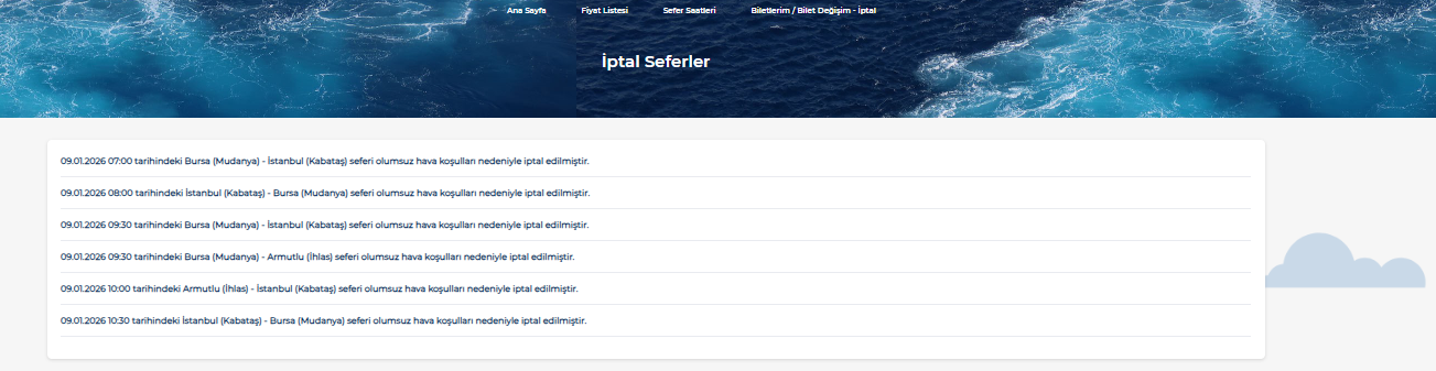 İptal edilen seferler ortasında Bursa (Mudanya) – İstanbul (Kabataş), İstanbul (Kabataş) – Bursa (Mudanya), Bursa (Mudanya) – Armutlu (İhlas) ve Armutlu (İhlas) – İstanbul (Kabataş) sınırları bulunuyor.