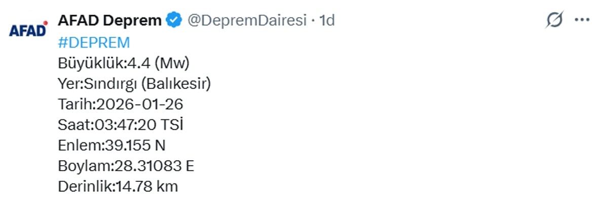 Afet ve Acil Durum İdaresi Başkanlığı (AFAD) Sarsıntı Dairesi datalarına nazaran saat 03.47’de Balıkesir’de 4.4 büyüklüğünde sarsıntı meydana geldi.